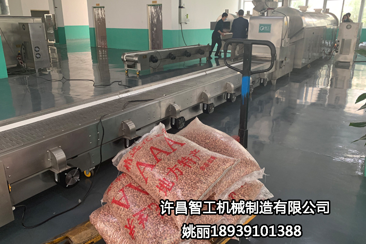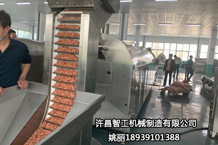 4月30日一大早,山西客户自带花生米300斤来厂考察,并试机6米电磁炒货机生产线炒制五香花生米。炒制五香花生米需要先把花生米泡制入味,然后晾晒大约3个小时,去除表皮多余的水分,最后入锅混炒至香酥脆即可。