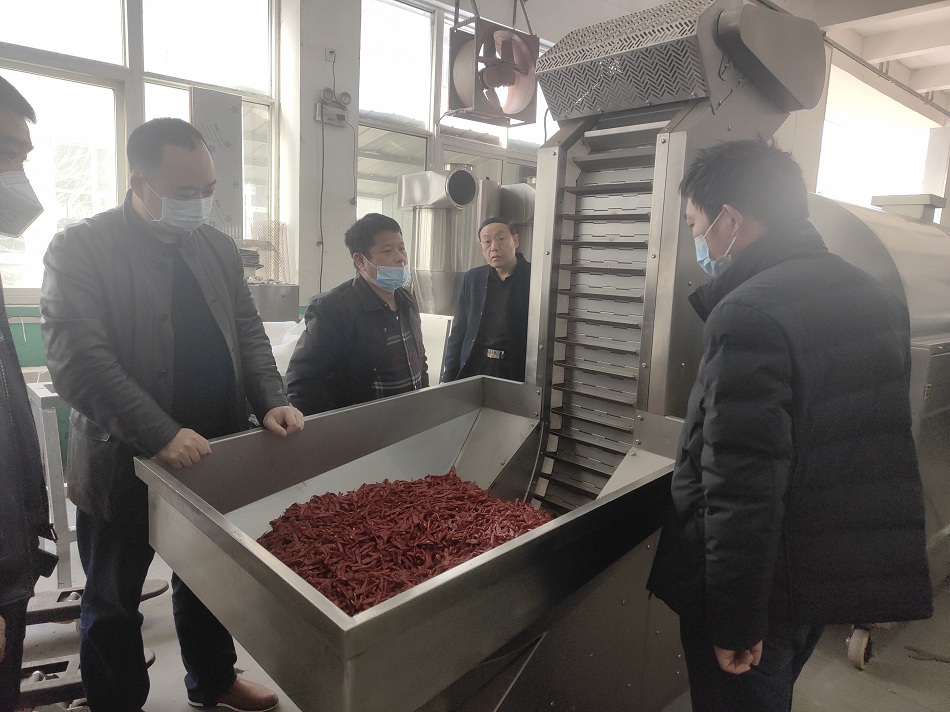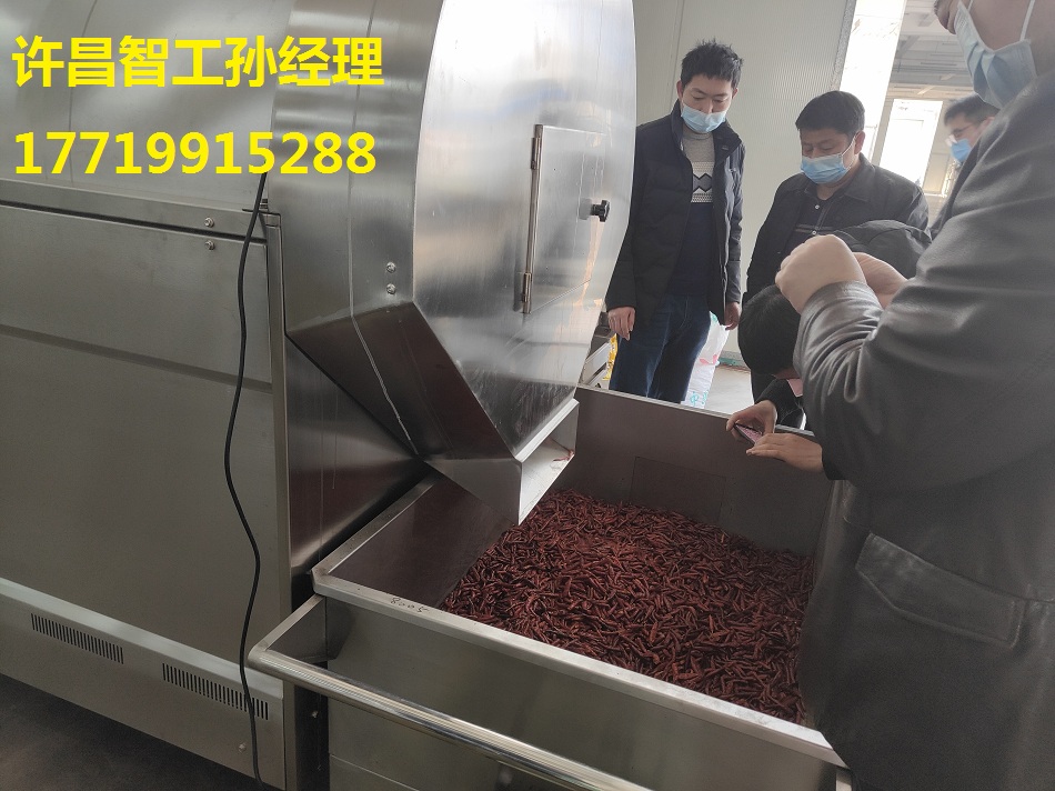 3.5日,湖南客户一行3人来许昌智工工厂试机炒辣椒!今天客户带了两袋辣椒用8米电磁流水线干炒机进行测试,根据要求达到客户满意!