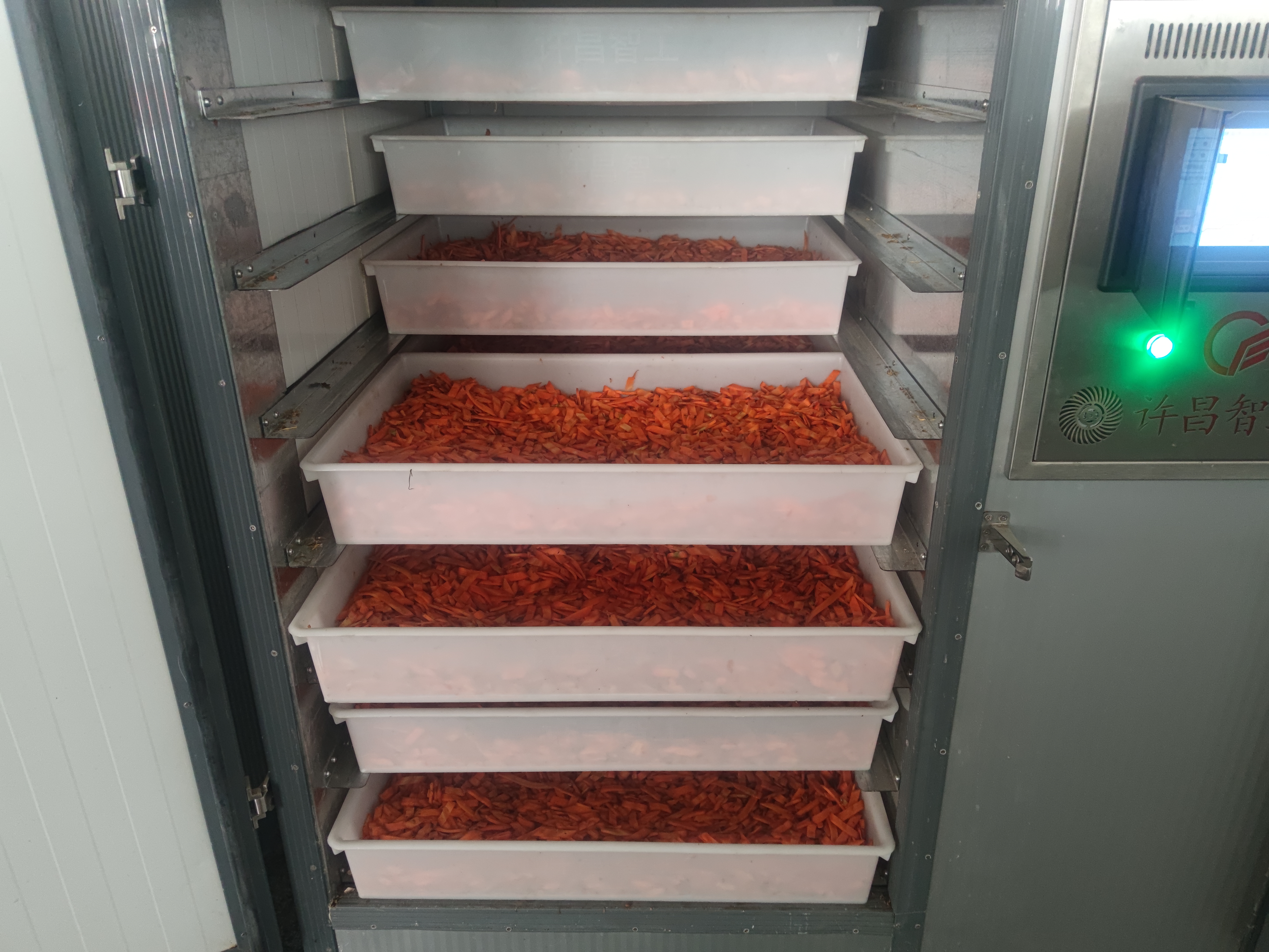 2021年3月15日 红萝卜切片后装箱20型空气能烘干设备,制作萝卜干,等待成品。