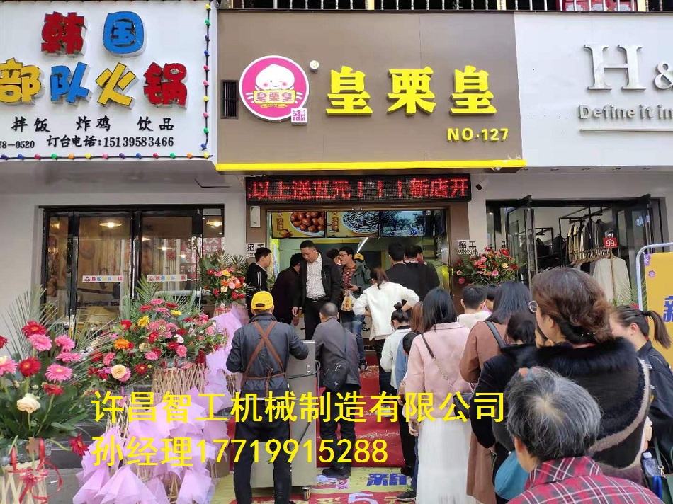 2019年11月9日,中国知名品牌“皇栗皇”公司直营连锁店平顶山分店隆重开业!现场人气十分火爆!皇栗皇公司三年前就和我们许昌智工合作,陆续采购了200多台炒板栗机,分别发到不同省份的连锁分店。祝皇栗皇公司财源滚滚!咨询订购热线:17719915288孙经理(微信同步)