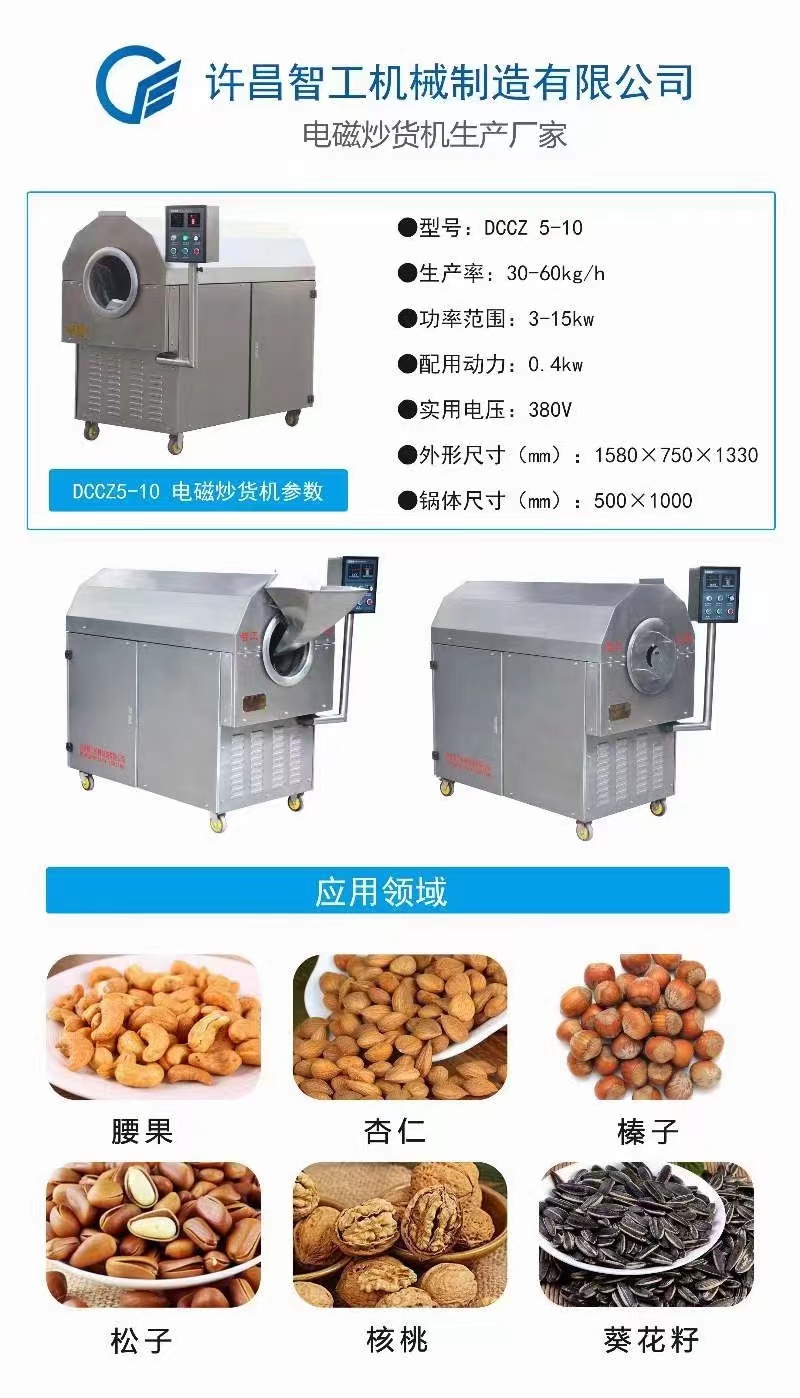 许昌智工电磁炒货机,炒板栗,炒瓜子,炒芝麻,炒南瓜籽,炒菜籽,炒花生果,炒大豆,炒辣椒,炒中药饮片,炒香榧,炒果仁,一机多用的多功能电磁炒货机,智能控温,标准化作业,正规实体厂家,质量有保障