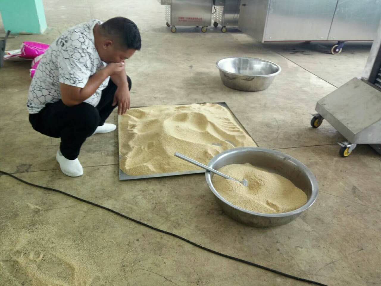 湖北做芝麻糖老板来厂考察电磁炒货机,炒脱皮芝麻试机中