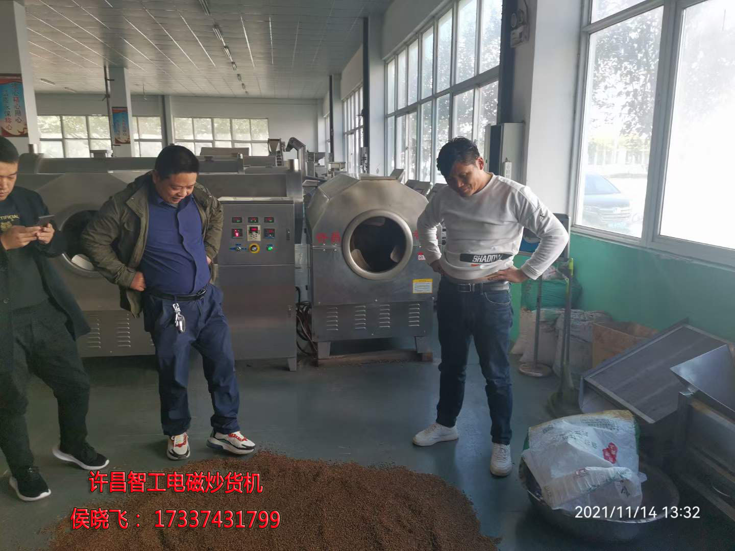 11.14日,河南商丘老乡带来100斤小麦,用许昌智工7-10型电磁炒货机炒制,炒好磨粉使用。小麦从进料到出锅20分钟客户说效果已经达到了,小麦炒制出锅后无论从色泽,还是口感都达到客户满意的效果,现场订购一台。