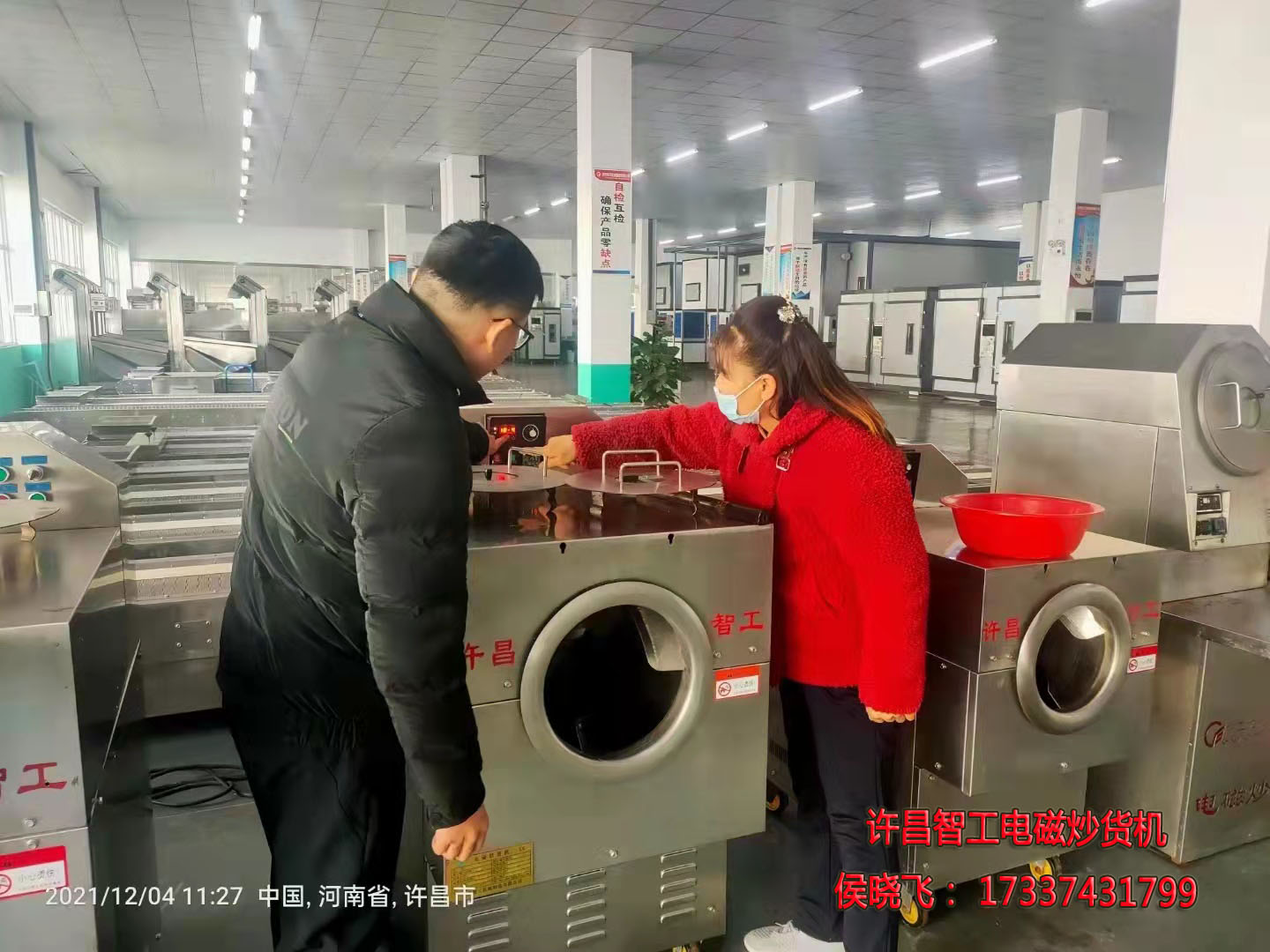 12.4日,郑州客户驱车一个半小时带来20斤板栗用许昌智工5-4型电磁炒货机炒制板栗,效果非常满意!