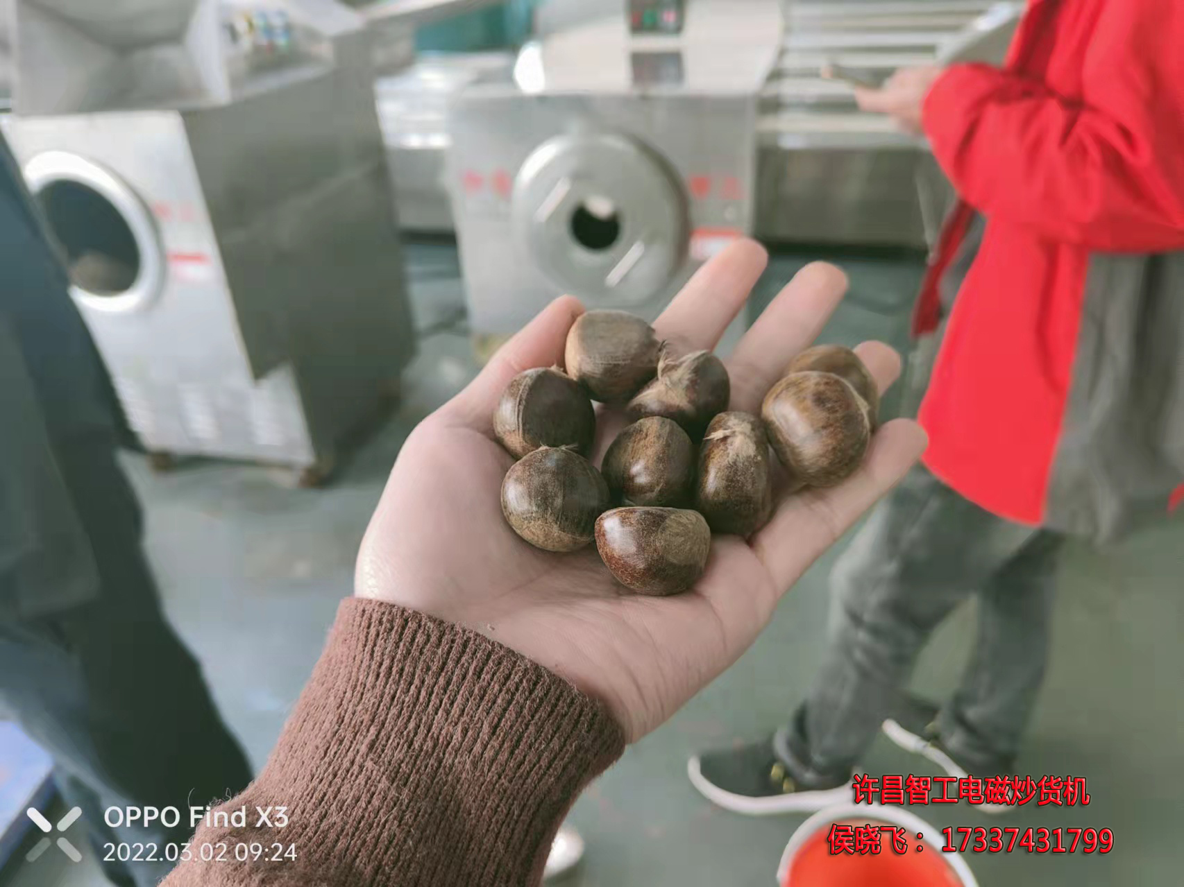 3.2日对于许昌智工是比较忙碌的一天,刚送走了第一波客户,又来了一波炒板栗的客户,亲自带来40斤板栗来厂试机5-4机型,炒制大约40分钟,板栗就炒好出锅了,效果非常好,想要在知道炒板栗的具体炒制参数可以详细加我微信17337431799详细了解,以下是实拍图片: