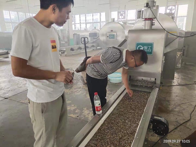 9月27号,唐山客户到许昌智工参观考察4米电磁流水线设备并试机,客户对试机效果非常满意当场签订合同定机4米流水线炒瓜子设备。