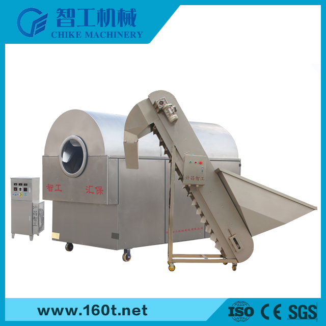 许昌智工炒货机炒货的加工流程是什么一般情况下,炒货的原料油草果、干草、八角、味精、花椒、食盐、胡椒、酒、桂皮等等,不同产品配料比例不同,通常是先加水至淹没原料,在60~100℃加热至水分干,然后再80到100℃温度下烘烤脆或者炒脆。可能有的朋友还不是很明确,下面以瓜子为例为大家说明。