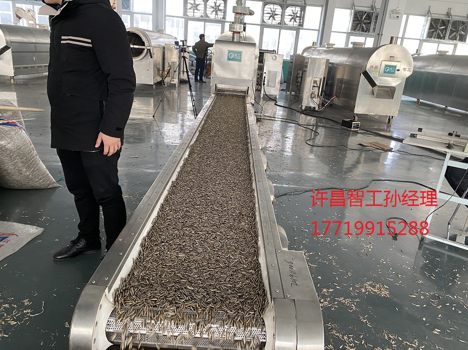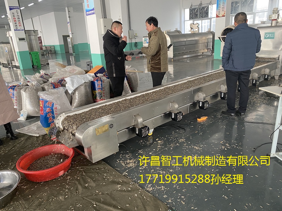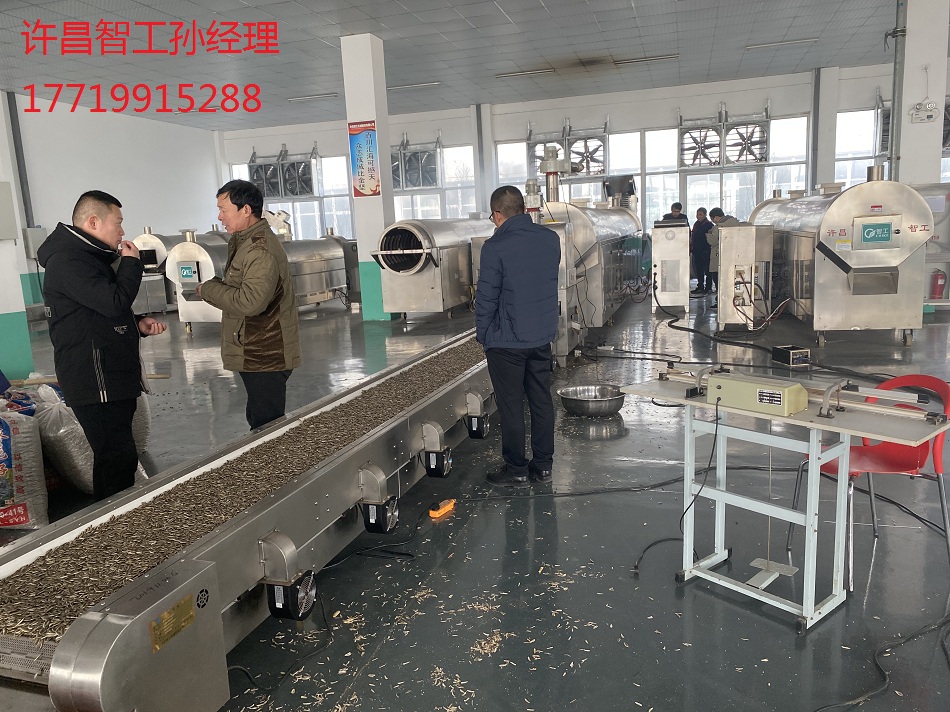 许昌智工6米电磁流水线一小时炒800斤瓜子!整套设备包含:定量提升机,炒货机,筛选机,冷却输送带。欢迎各界朋友前来考察试机!咨询热线:17719915288孙经理(微信同号)